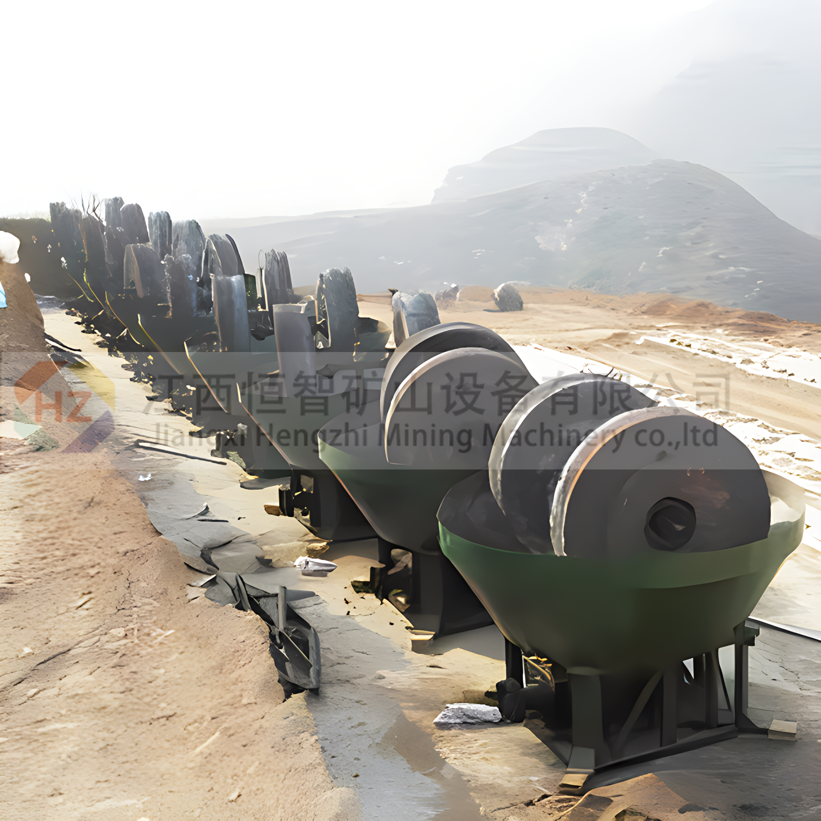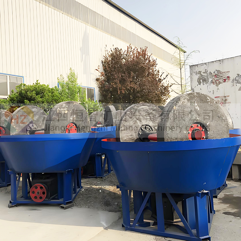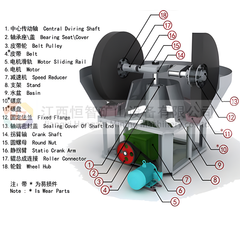 该设备主要由动力装置、机架、水盆、碾轮、碾盘等部件组成,采用轮动式磨矿工作方式:首先电动机将动力传动至减速机,在减速机带动下,通过大立轴将力矩传递给上方的横轴,然后经安装在横轴两端的拉杆传递至碾轮,使碾轮产生驱动力,沿横轴水平方向做逆时针旋转运动;工作时的碾轮既能围绕湿碾机大立轴公转,又能围绕碾轮中心轴进行自转,碾盘则固定不动。添加的矿石物料,在碾磨机内受到来自,碾轮自身重量带来的挤压力,碾轮公转自转时与碾盘产生的巨大摩擦力,在受到反复的挤压、揉搓、研磨后,被彻底粉碎。