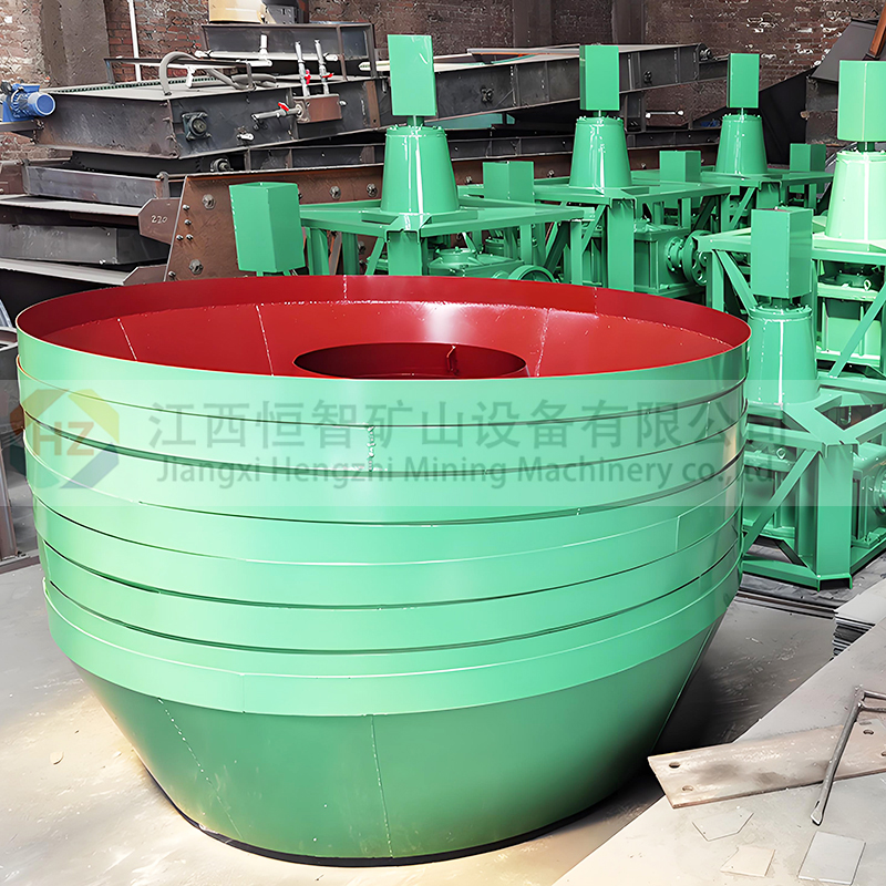 碾轮在碾压、揉搓矿物的同时,兼具混合搅拌造浆功能,将物料与水充分混合均匀,使矿浆浓度等各项磨矿指标稳定;经研磨粉碎后的单体解离矿物细粒,在混动的矿浆中,被带至液面上层,经设置在水盆上的溢流排料口,溢流排出,进入下一作业工序加工;粗粒矿物则沉降在碾盘底部,继续研磨粉碎,直至细度达到标准;设置在水盆排料口处的筛网(筛网目数,应根据矿物类型,分选要求,合理设置),可严格控制分级粒度,避免出现矿物过粉碎或粒度粗细不均现象,为后续作业创造良好条件。