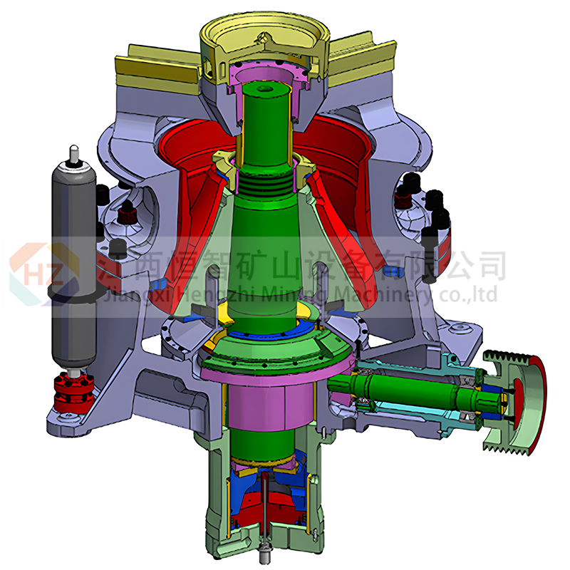 圆锥破碎机结构简介:圆锥破碎机其结构主要有机架、水平轴、动锥体、平衡轮、偏心套、上破碎壁(固定锥)、下破碎壁(动锥)、液力偶合器、润滑系统、液压系统。